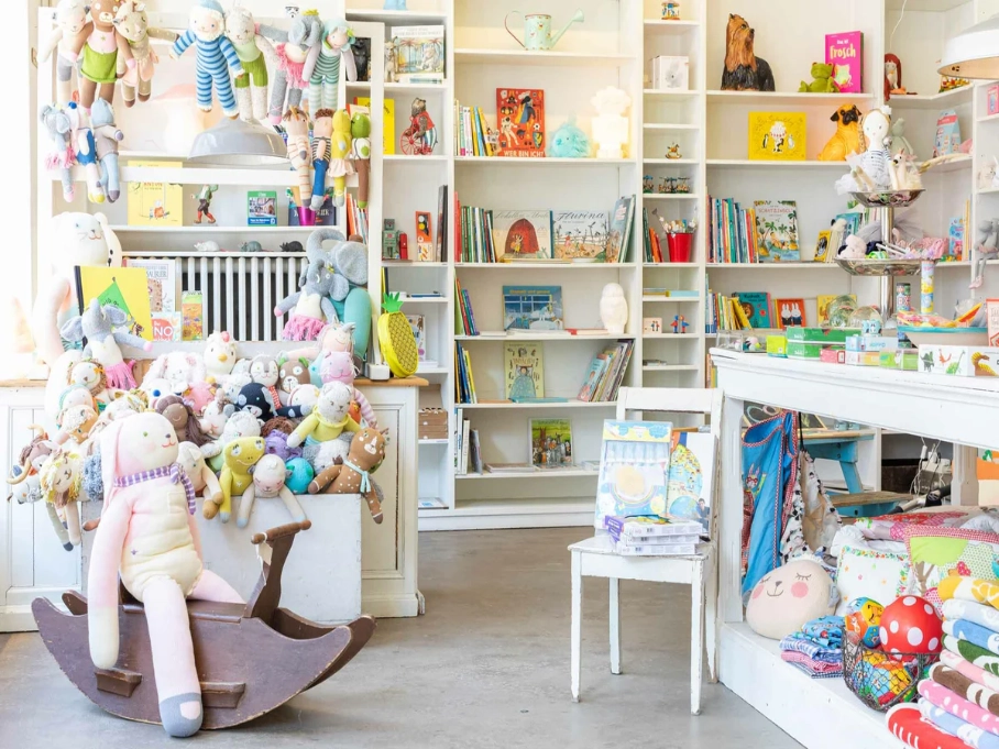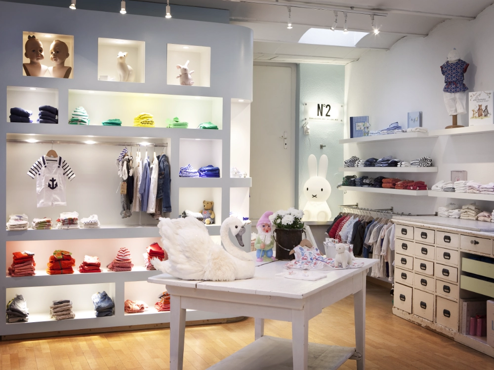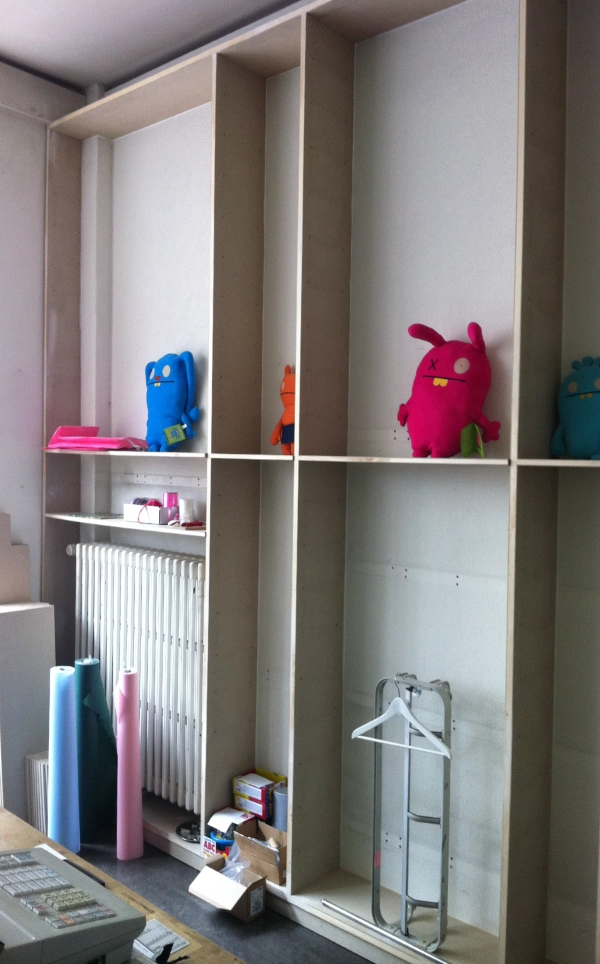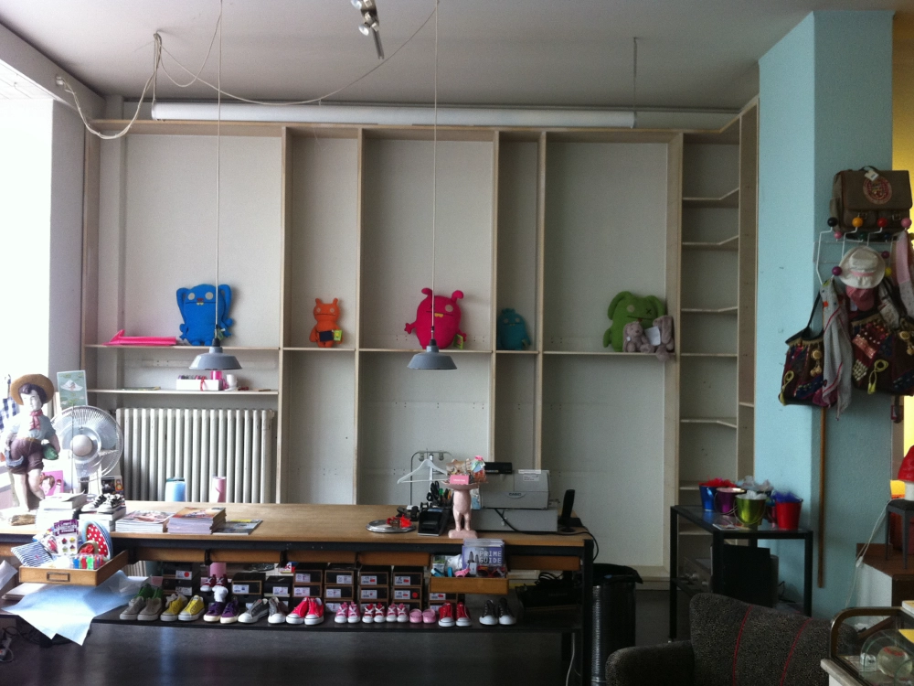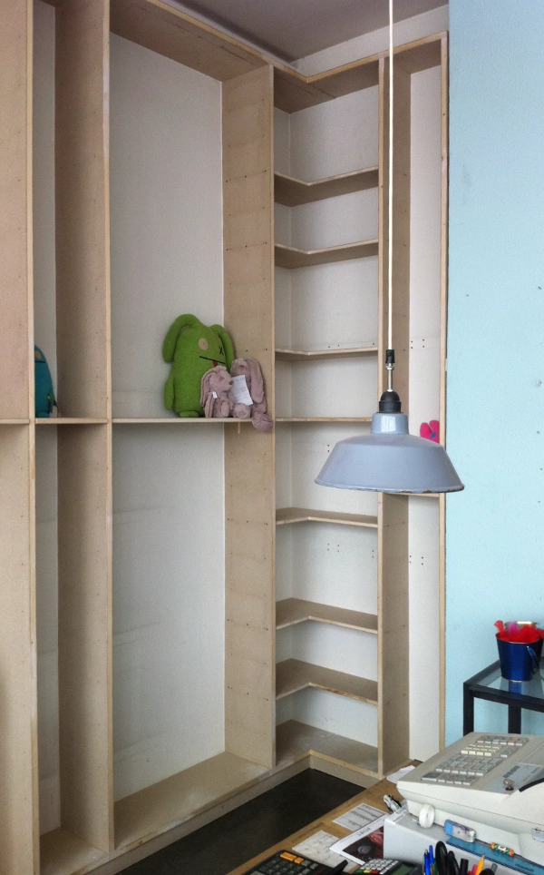 Es handelt sich um ein verspieltes, raumhohes Eckregal mit individuell verstellbaren Tablaren, das sich sowohl als Vitrine als auch als Stauraum nutzen lässt. Das Ausstellungsmöbel verfügt über eine abgerundete Ecke und fungiert gleichzeitig als Abtrennung für die kleine Küche im Geschäft.